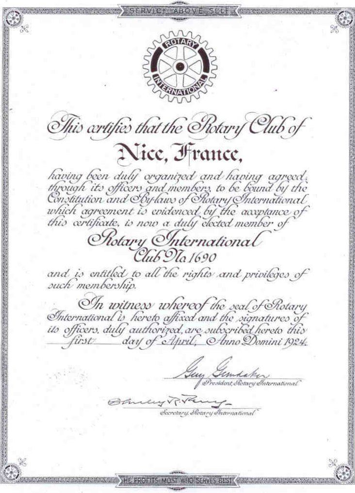Ce dernier sera suivi, deux ans plus tard, par deux nouveaux clubs : Toulouse et Lyon. En 1924, le club de Nice, le quatrième club rotarien de France, voit le jour.